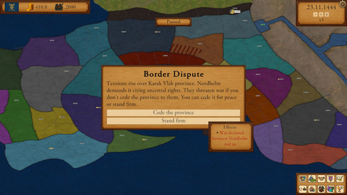 Currently the only unique event is for the Dwarven Kingdom. It involves its border dispute with Nordhelm. As Dwarven Kingdom, the player can choose to cede the border province of Karak Vlak to Nordhelm or else a war will break out.